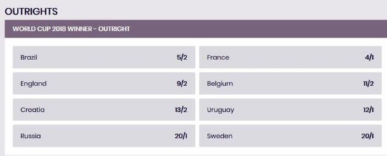 英格兰成为热门了 随着英格兰点球大战以总比分5-4淘汰哥伦比亚。世界杯8强已经全部产生,著名博彩公司dabblebet也更新了最新的夺冠赔率,巴西以2赔5排名第一,法国1赔4排名第二,英格兰飙升至第三位,赔率为2赔9。 从上半区来看,巴西与法国还是两支最热门的球队。他们有望在半决赛当中会师,博彩公司看好他们其中的一支球队会突围上半区。巴西是最被看好的球队,他们的夺冠赔率仅为2赔5,在世界杯开赛之前,巴西的夺冠赔率是1赔5.5。法国的夺冠赔率为1赔4,相对而言比利时与乌拉圭的前景并不被看好,比利时的夺冠赔率是2赔11,乌拉圭为1赔12。