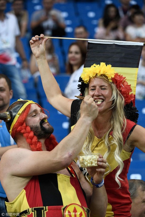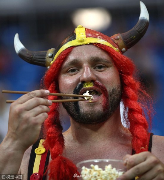 2018年7月2日,俄罗斯,2018俄罗斯世界杯1/8决赛,比利时Vs日本,用筷子吃爆米花的精致女装大佬。
