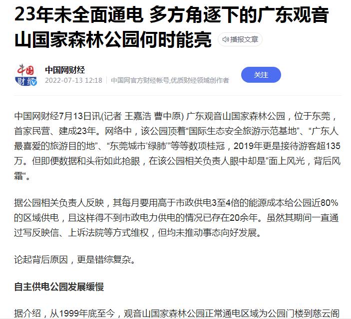 中国网财经2022年报道的《23年未全面通电 多方角逐下的广东观音山国家森林公园何时能亮》