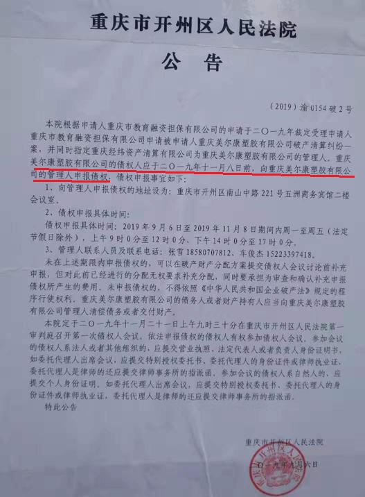 2019年9月6日,开州区法院发布公告,要求债权人进行债权登记。
