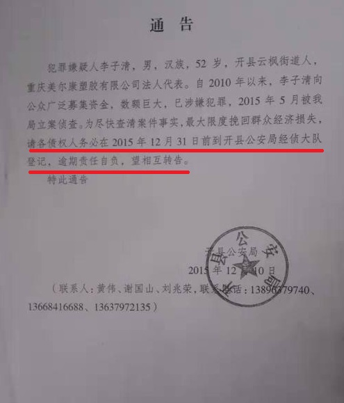 2015年12月10日,开县公安局发布公告,要求债权人进行登记。