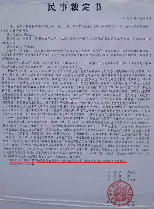 2019年7月17日,开州区法院裁定,受理申请人对美尔康公司的破产清算申请。而提请执转破的教育融资担保公司也是之前申报过的债权人,法院为何要单独受理该债权人的民事诉讼?难道250多名3000受害人都另行进行民事起诉来讨回自己的钱么?!如此一来,之前刑事判决的返还受害人财产岂不是一纸废话?!