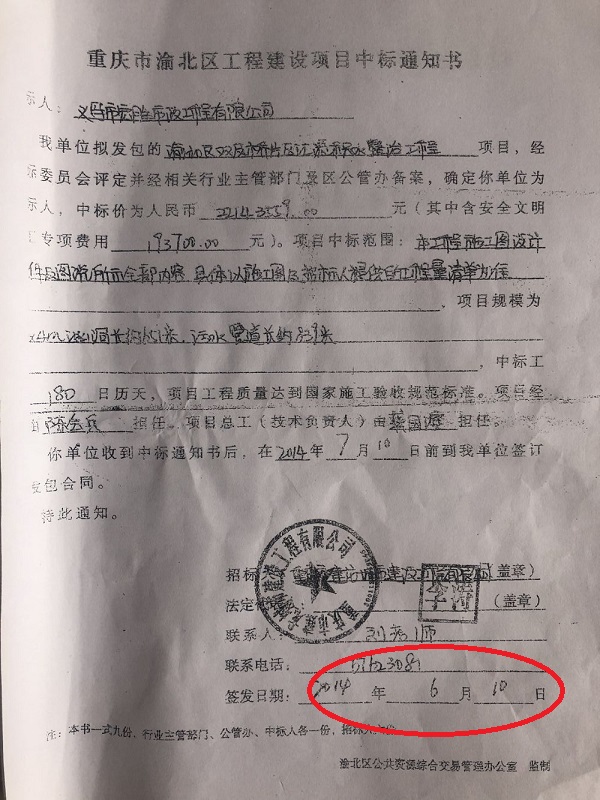 6月10日,义乌宏胜市政公司获得中标通知书。