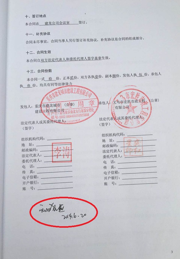6月20日,发包人重庆市城市建设工程有限公司与义乌市宏胜市政工程有限公司签订《建设工程施工合同》。“渝北双汇桥片区汇流积水整治工程”签约合同价为2214.3559万元(含安全文明施工费19.37万元)。