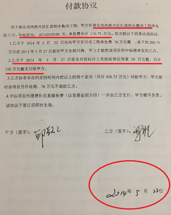 近日重庆市开州区的曾胜向法讯君举报义乌市宏胜市政工程有限公司卖标后将其坑惨的情况。2014年5月,多次合作的朋友邱敬元(重庆某公司董事长)给曾胜电话说有个优质工程中标了可以给他做。22日,宏胜市政代表人邱敬元和曾胜签订付款协议。约定将中标价为2214.3599万元的“渝北双汇桥片区汇流积水整治工程”承包给曾胜,曾胜为此花了400多万元获得这个造价2千多万元的工程,约定的买标按14个点子算,也就是276万多元