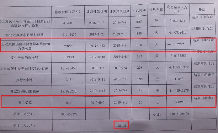这表显示宏胜公司为曾胜借款(垫付)了160多万元,收取了118万多元的利息(按天计算),总计278.96万元,和最后一笔款到宏胜公司的金额基本一致。而值得注意的是在2019年5月9日曾胜借款4千元,仅60天的利息就收取240元!更令人气愤的是法院冻结的2百万元宏胜公司收取了66万元的利息后,从2017年1月23日再次计息,到2019年7月8日共896天宏胜公司又计算了59万多元的利息!