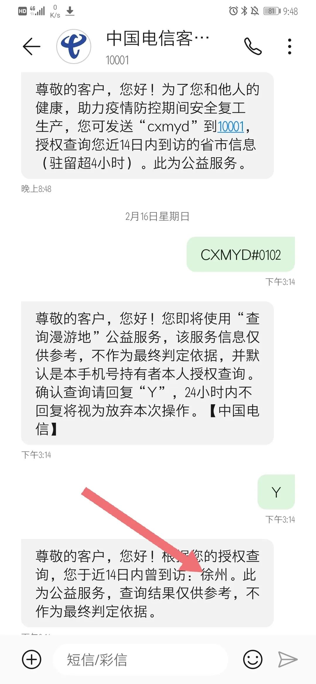 社区工作人员查验我的身份证,说我是湖北人,拒绝让我进小区。我解释说,整个春节期间我都在徐州,根本没回过湖北。他们不听,还是坚持,只要是湖北人,一律不让进。我把下午在徐州时,短信电信的查询结果给他们看,上面清楚显示我最近14天一直在徐州。他们仍说只看户籍,不看这个。