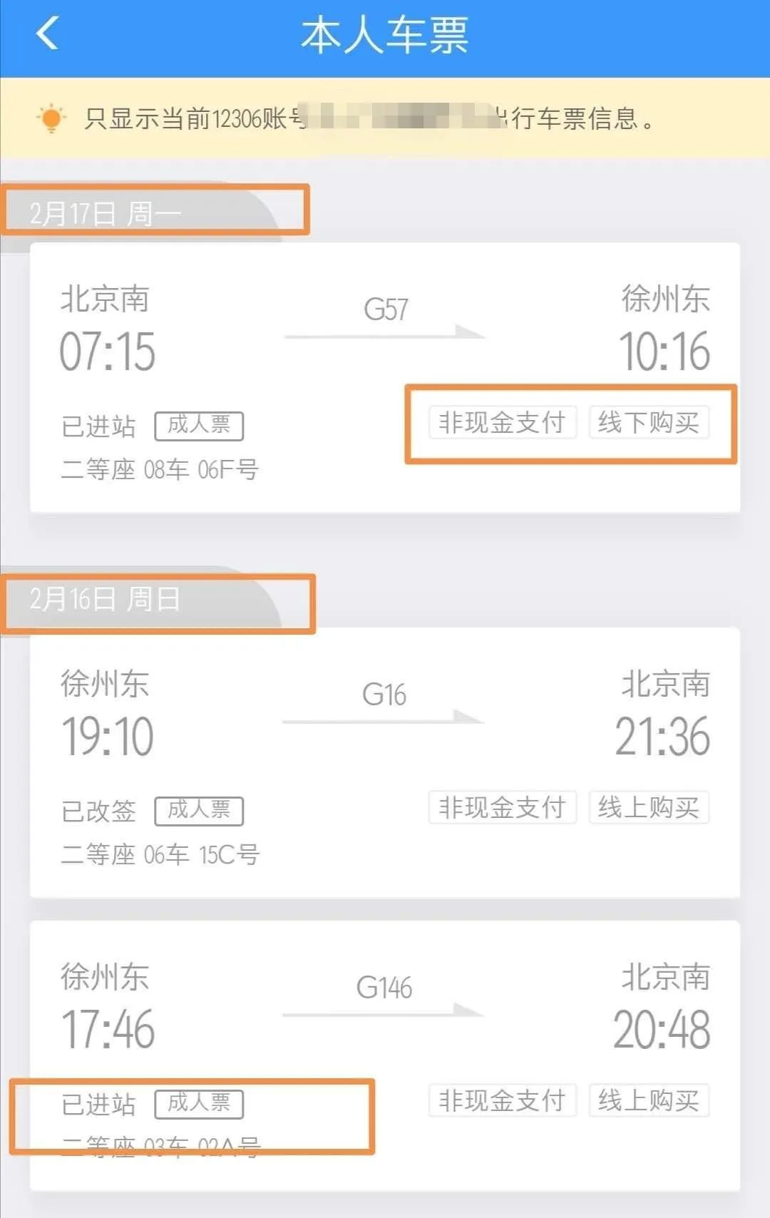 当日返回徐州的车票订单记录。