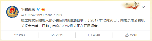 钱宝网实际控制人张小雷因涉嫌违法犯罪,已于2017年12月26日,向南京市公安机关投案自首