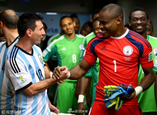 2014年6月25日,巴西贝拉里奥球场,2014巴西世界杯小组赛F组,尼日利亚Vs阿根廷。 梅西与恩耶马握手