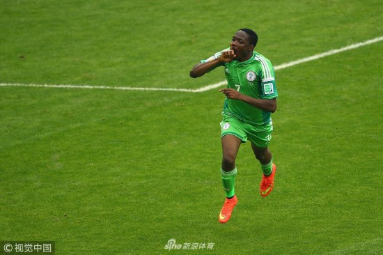 2014年6月25日,巴西贝拉里奥球场,2014巴西世界杯小组赛F组,尼日利亚Vs阿根廷。 穆萨劲射破门