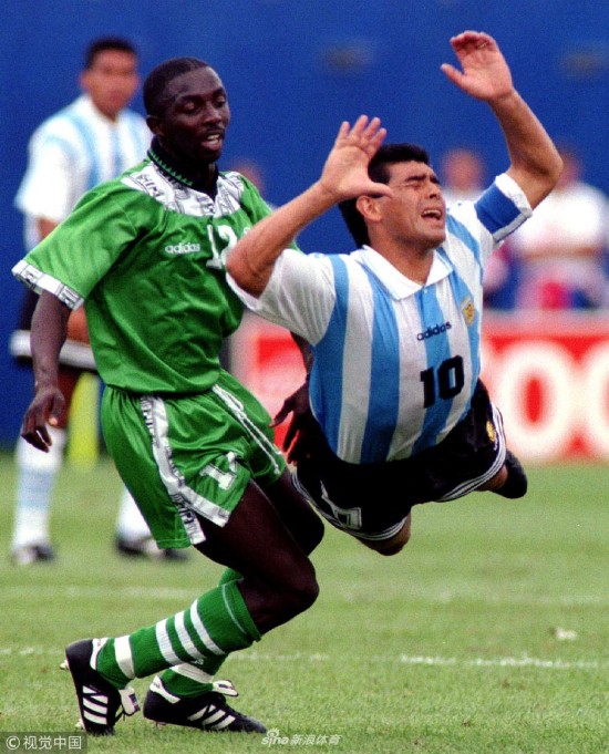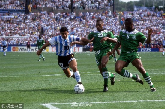 1994年6月25日,美国波士顿,1994美国世界杯小组赛,阿根廷2-1尼日利亚。卡尼吉亚和马拉多纳。