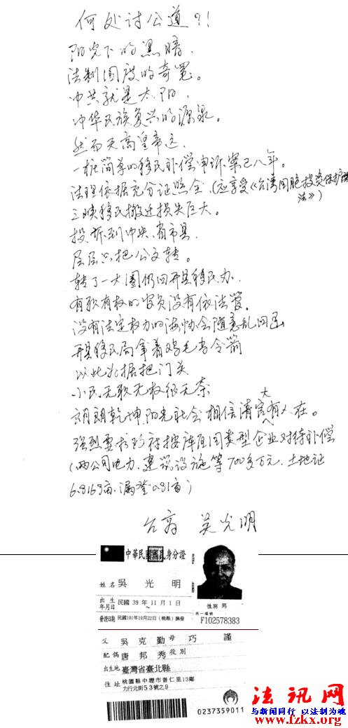 申诉人:吴光明,男,64岁,祖籍重庆市开县,现住于台湾桃园县中坜市力行北街53号---9。系重庆开县台资企业开县东丰再生资源开发中心、万县光大轧钢有限公司副董事长。