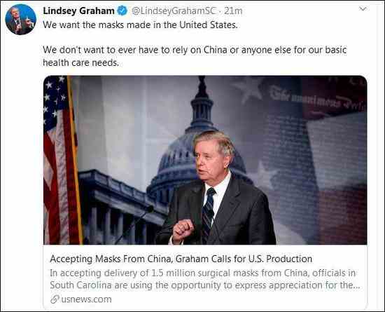 | [文/观察者网 徐蕾]据美联社当地时间4月26日报道,当天,美国南卡罗莱纳州接受了来自中国的150万个外科口罩。 在格林维尔-斯帕坦堡机场(Greenville-Spartanburg Airport)的停机坪上,看着这些口罩从波音飞机上卸下后,南卡罗莱纳州共和党参议员林赛·格雷厄姆(Lindsey Graham)说,“我们想要美国制造的口罩,我们不想依赖中国或其他任何国家来满足我们基本的医疗需求。” 格雷厄姆说,他预计今年秋天新冠病毒会卷土重来,他希望美国在出现疫情之前对所需的供应“有更好的准备”,希望“医疗供应链正在回到美国”。 当天,格雷厄姆还发推特表示感谢,但也感叹,希望美国减少对中国的依赖。 “我感谢所有为南卡罗莱纳的普利斯马医院提供了100多万个口罩的人们。也感谢波音公司提供波音747梦想运输机 (Dream Lifter) ,从中国把这些医疗用品运过来。” “然而,今天再次提醒我们——我敢说‘醒醒吧’——我们的医疗供应链已经变得如此依赖中国。如果疾病在秋天卷土重来,希望我们不会再这样依赖中国的医疗设备,希望这些是美国制造。” ![]() 格雷厄姆随后在转发美联社报道的同时,又一次强调称:“我们想要美国制造的口罩,我们不想依赖中国或其他任何国家来满足我们基本的医疗需求。” ![]() 推特截图 美联社报道称,在疫情暴发的整个过程中,格雷厄姆一再呼吁美国减少对中国的依赖,在推特、媒体采访中,他都表达过类似的观点。 美国众议员威廉·蒂蒙斯(William Timmons)16日回应格雷厄姆称,必须从中国进口口罩“这种事情不会再发生了”。 据南卡罗来纳州官方数据,截至26日,该州有近5500人的新冠病毒检测结果呈阳性,其中至少有174人死亡。26日从中国运去的150万个口罩足够该州普利斯马医院使用一个月。此外,在这批货物中,有10万个口罩正被送往南卡罗来纳医科大学。 自疫情在全球暴发以来,各国都十分依赖中国提供的口罩等医疗用品。美国、法国、加拿大等国均多次派专机前来中国提口罩。但是同时,美国对中国医疗用品的依赖感到无奈。 纽约州长科莫在4月17日的发布会上就提到了中国,他表示,“我们需要的口罩来自中国,我们需要的手术服来自中国,我们需要的防护面罩来自中国,我们需要的呼吸机来自中国。好了,我们过了那个阶段了,现在到了新阶段,我们需要检测药剂,也来自中国……怎么会这样!” |