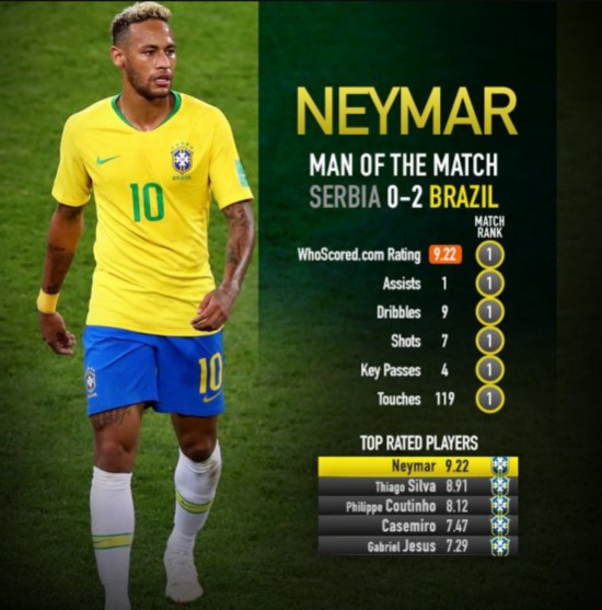 内马尔伤愈复出后压力巨大,热身赛虽表现不俗连续进球,可世界杯比赛强度与肢体对抗级别完全不同,巴西首战平瑞士,内马尔无数次被对手撂倒在地,光被对手犯规就有10次,几乎与他抗议判罚的次数一样众多,可舆论与球迷赛后却吐槽这位巴西一哥摔倒次数太多,甚至是一碰就倒。 巴西是世界杯夺冠头号热门,却首战就受挫,次轮是非胜不可,然而对垒哥斯达黎加也是前90分钟始终未能破门,直到伤停补时阶段库蒂尼奥才打破僵局,随后内马尔打入本届大赛首球定胜局。进球后内马尔做出割喉的庆祝动作,而终场哨响后内少还坐在地上痛哭不止。非胜不可的压力,抗议裁判引起双方摩擦被出示黄牌等因素,都让巴西一哥压力巨大。 末战塞尔维亚是巴西的出线生死战,内马尔两次获得破门良机,可惜与上轮对垒纳瓦斯时情况类似,射门均被对手门将斯托伊科维奇奋勇扑出。不过内少还是通过角球传中助攻蒂亚戈-席尔瓦破门,两位巴黎圣日耳曼队友上轮曾发生摩擦,席尔瓦将球踢出界让对方疗伤,结果遭内少怒吼,巴西中卫顿感委屈,还将此事捅给媒体,这次进球配合后两人拥抱庆祝,应能解开心结化解矛盾。 内马尔1个进球1次助攻,助巴西拿下两连胜,强势反弹后拿下小组头名。不可否认的是,内少小组赛并未打出最佳状态,不过他依然是巴西场上最具威慑力的球员,制造威胁最多的主将:小组赛3战,巴西10号总计有4项数据排名所有球员第1,其作用依然是任何队友所无法取代的。 世界杯3战内马尔射门16次(C罗与克罗斯15射并列第2,米特洛维奇14射),尝试突破过人29次(梅西27次第2,伊斯科与沙特中场杜萨里均为21次),制造犯规17次(C罗13次第2,基米希12次第3),关键传球11次(与厄齐尔、基米希以及沙特中场法拉杰并列第1,库蒂尼奥与穆勒各10次),均是所有球员中最多的。 (Cuchu) |