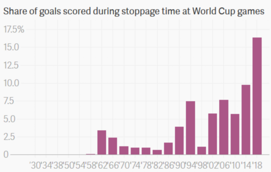 历届世界杯补时进球占比 这是什么概念?自1958年世界杯引入补时概念以来,此前最高的比例就是上届世界杯,补时进球占比10%,但和今年相比也是小巫见大巫。