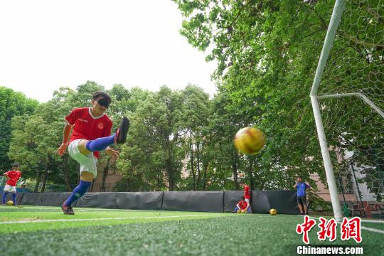 盲人足球队员王志华在训练射门。贺俊怡摄 中新网贵阳6月30日电 题:贵州盲人足球队:奔跑中逐渐自信渴望站上世界杯舞台 作者周燕玲 李婧 停球、运球、射门……动作一气呵成,足球伴随着叮铃铃的响声飞入球网。在贵州特教中职校的足球场上,贵阳首支盲人足球队正在进行他们每天的例行训练。