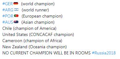 冠军们缺席 更加残酷的是,新科美洲杯冠军智利、新科中北美金杯赛冠军美国、新科非洲国家杯冠军喀麦隆以及新科大洋洲国家杯冠军新西兰甚至都没有拿到2018俄罗斯世界杯的参赛席位。 至此,世界杯14支还有没有被淘汰的球队已经看不到任何新科冠军的身影了。 (路易) |